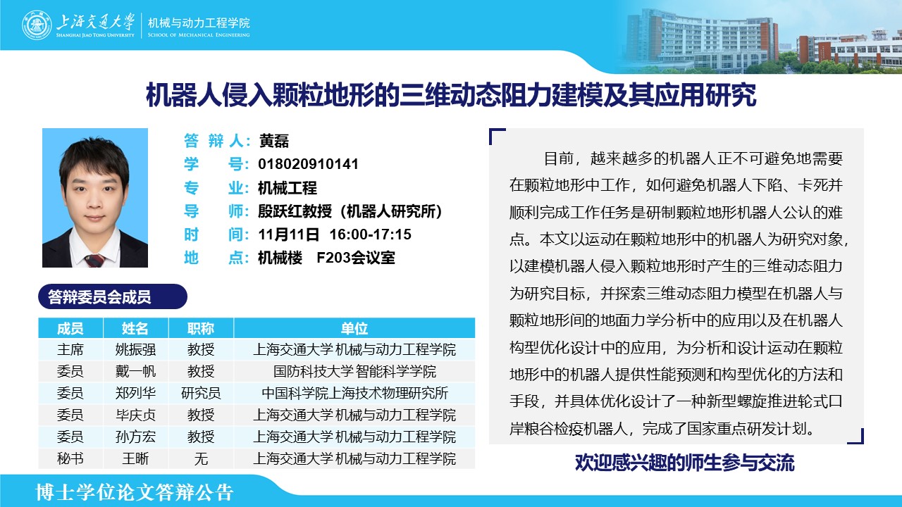 答辩人:黄磊| 导师:殷跃红 | 时间:11月11日 16:00 – 17:15 | 地点:机械楼 F203会议室