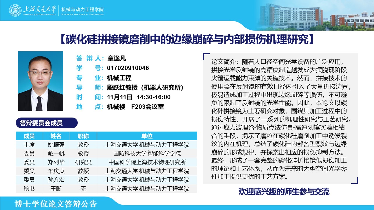 答辩人:章逸凡| 导师:殷跃红 | 时间:11月11日 14:30 – 16:00 | 地点:机械楼 F203会议室