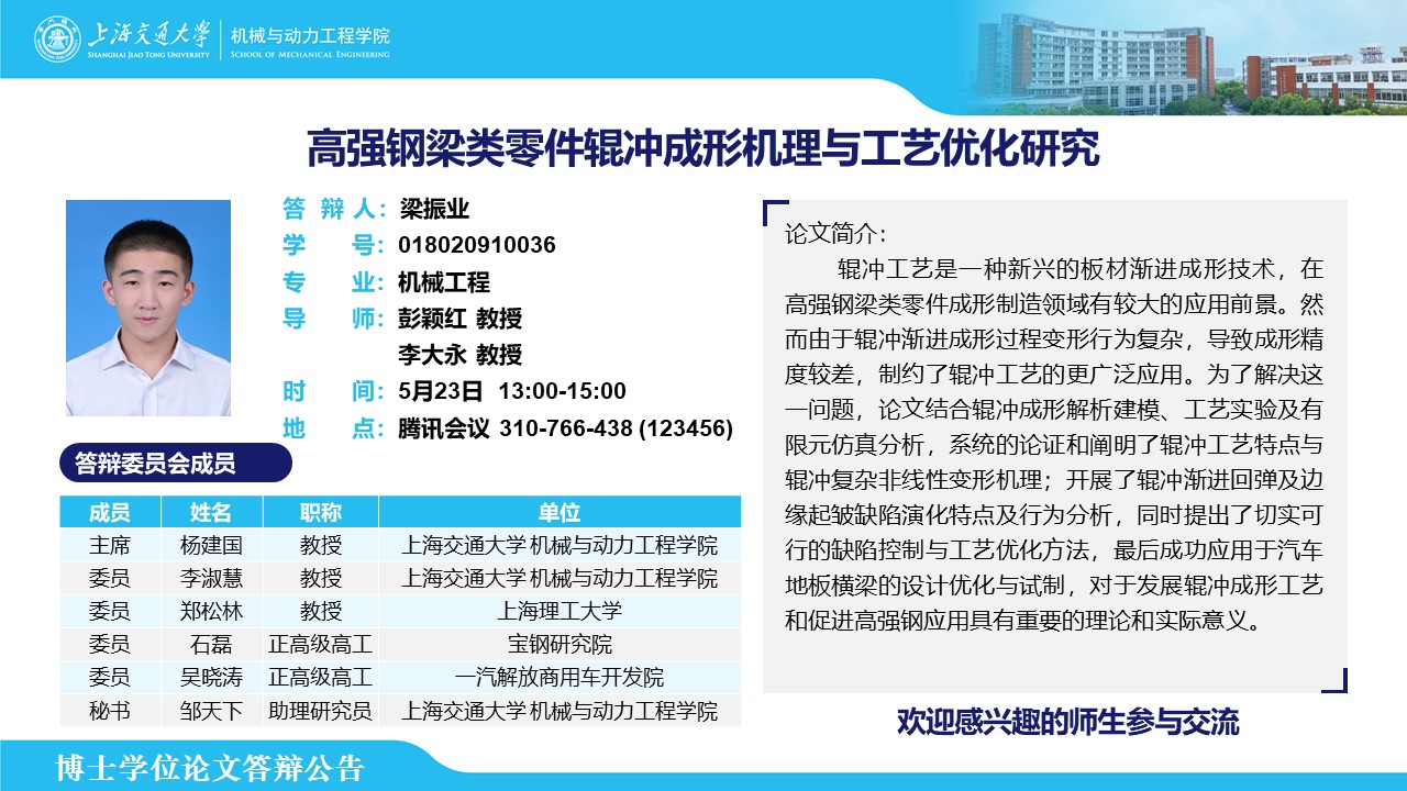 答辩人:梁振业 | 导师:彭颖红 李大永 | 时间:5月23日 13:00-15:00 | 腾讯会议号码:310766438 参会密码:123456