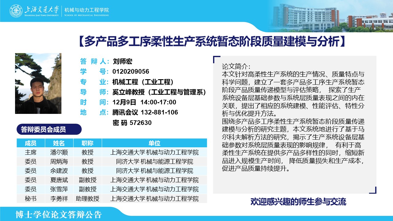 答辩人:刘师宏 | 导师:奚立峰| 时间:12月9日 14:00 – 17:00 | 腾讯会议会议号:132881106 密码:572630