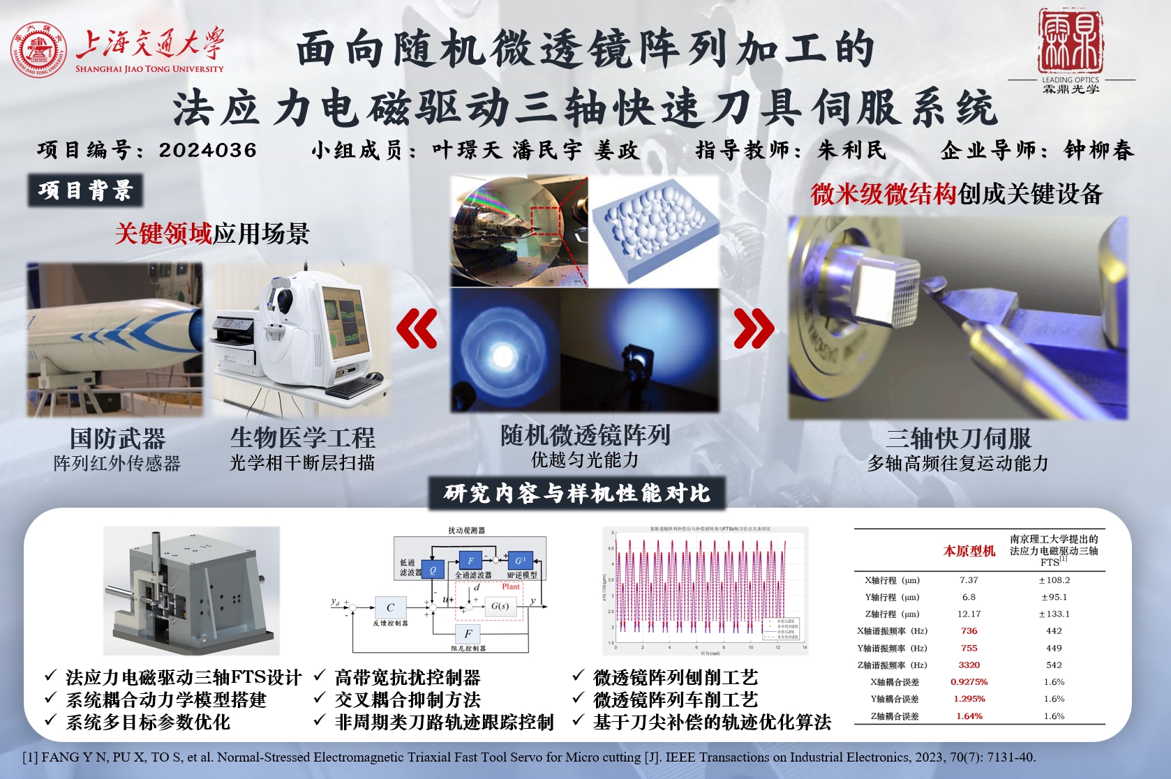 本项目提出了一套具有创新性设计概念的法应力电磁驱动三轴FTS系统,实现了系统高频响、低耦合、强抗扰的设计目标;利用所提出的高速精密运动控制器控制装置各轴与车床联动,依照所提出的车削、刨削优化刀路轨迹实现了随机微透镜阵列模具的高效、高精加工。项目目前已申请一项国家发明专利,并有两篇学术论文撰写中;项目成功通过霖鼎光学(上海)有限公司的企业验收测试,在超精密制造领域具有广阔的应用前景与极佳的市场价值。