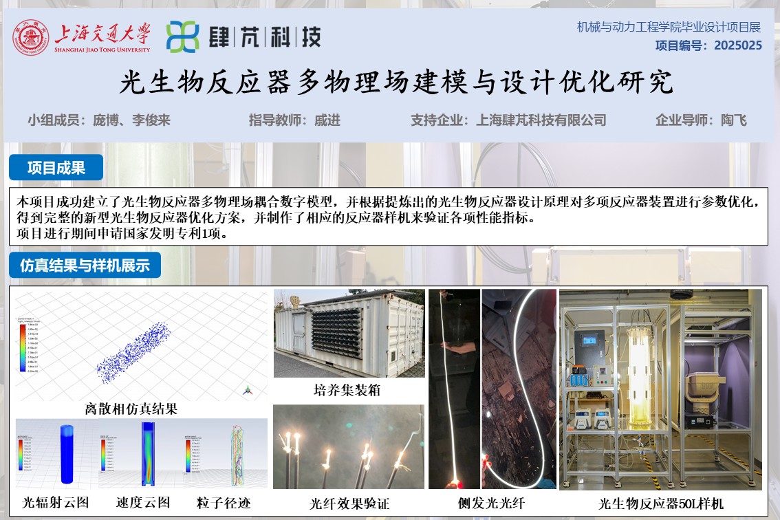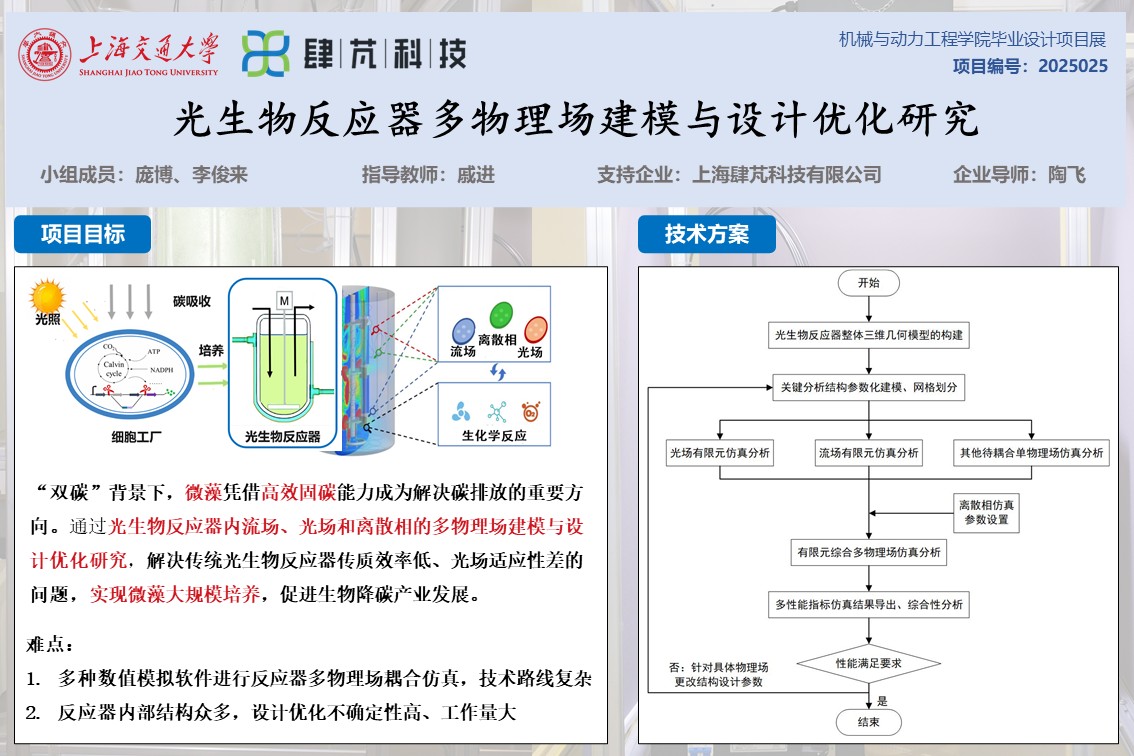“双碳”背景下,微藻凭借高效固碳能力成为解决碳排放的重要方向,但传统光生物反应器因传质效率低、光场适应性差等问题,难以实现微藻大规模培养,限制了生物降碳产业发展。本项目围绕光生物反应器多物理场耦合建模仿真,建立数字孪生模型,得到反应器内流场、光场、离散相分布情况,并总结提炼出具有创新性的新型光生物反应器设计原理,并基于数字模型优化设计参数得到新型光生物反应器,改进反应器性能与能耗指标,提升微藻培养效率。