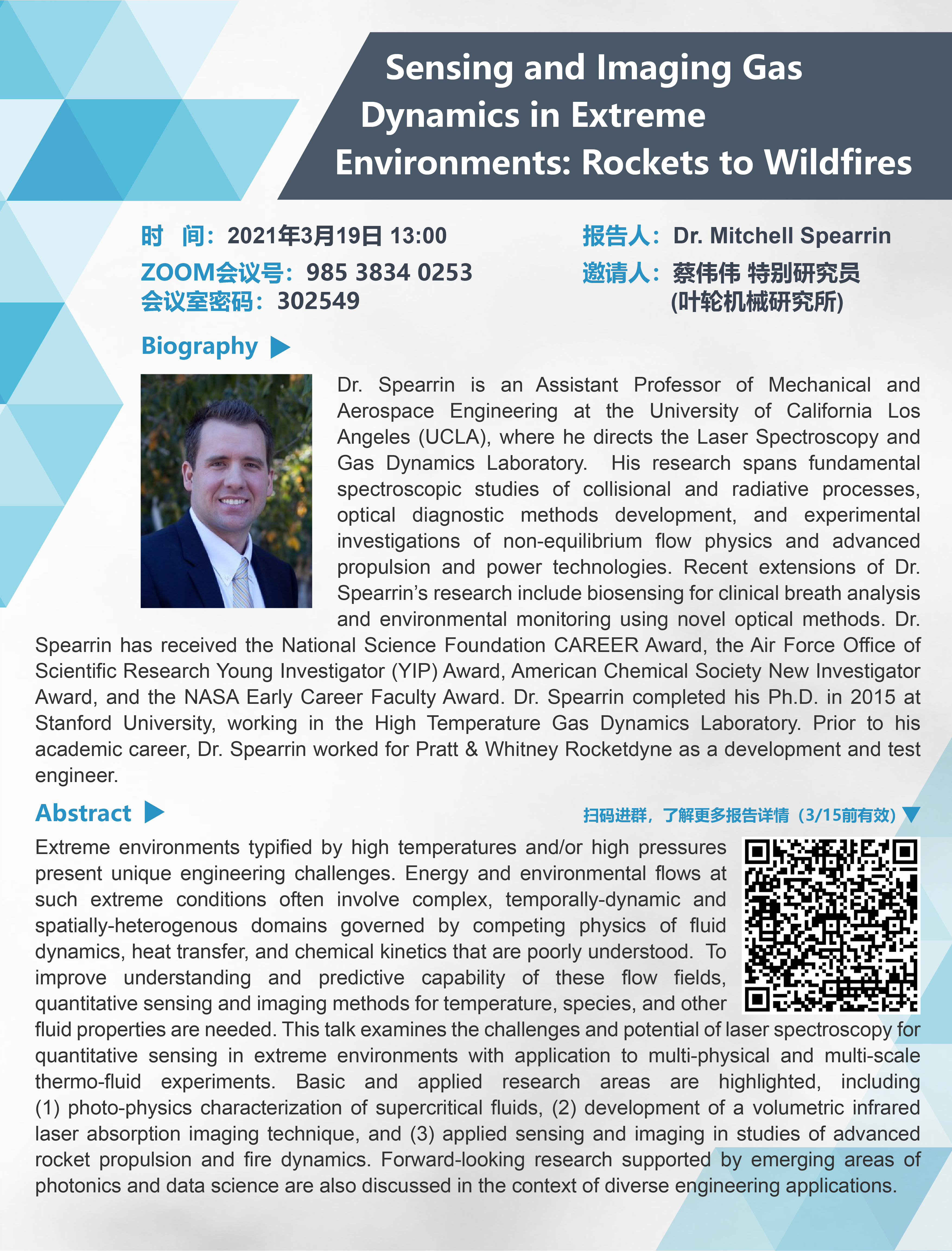 ects the Laser Spectroscopy and Gas Dynamics Laboratory.  His research spans fundamental spectroscopic studies of collisional and radiative processes, optical diagnostic methods development, and experimental investigations of non-equilibrium flow physics and advanced propulsion and power technologies. Recent extensions of Dr. Spearrin’s research include biosensing for clinical breath analysis and environmental monitoring using novel optical methods. Dr. Spearrin has received the National Science Foundation CAREER Award, the Air Force Office of Scientific Research Young Investigator (YIP) Award, American Chemical Society New Investigator Award, and the NASA Early Career Faculty Award. Dr. Spearrin completed his Ph.D. in 2015 at Stanford University, working in the High Temperature Gas Dynamics Laboratory. Prior to his academic career, Dr. Spearrin worked for Pratt & Whitney Rocketdyne as a development and test engineer.