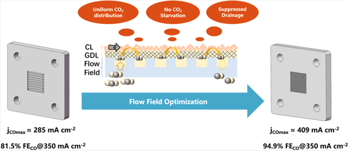 Focusing on the CO2RR technology and the design of the “zero-gap CO2 electrolyzer”, this article elucidates the mechanism of the flow field on the performance of CO2 electrolysis. It points out the importance of the flow field on the water-gas transport process inside the CO2 electrolyzer under the industrial-relevant current density and operation condition. Through experiments and simulations to analyze the effects of different flow field configurations on the performance and durability of CO2 electrolyzers, the core design strategy for optimizing the flow field of CO2 electrolyzers is elucidated: i.e., improving the uniformity of the CO2 distribution, inhibiting CO2 starving transport while suppressing the drainage. Based on this design strategy, the article designs a simple and improved flow field, which improves the electrolysis performance by 43.5% compared to the conventional parallel flow field. This work illustrates the necessity of enhancing the study of the water-gas mass transport process in CO2 electrolyzers, which is instructive for the development of commercial CO2 electrolyzers in the future.