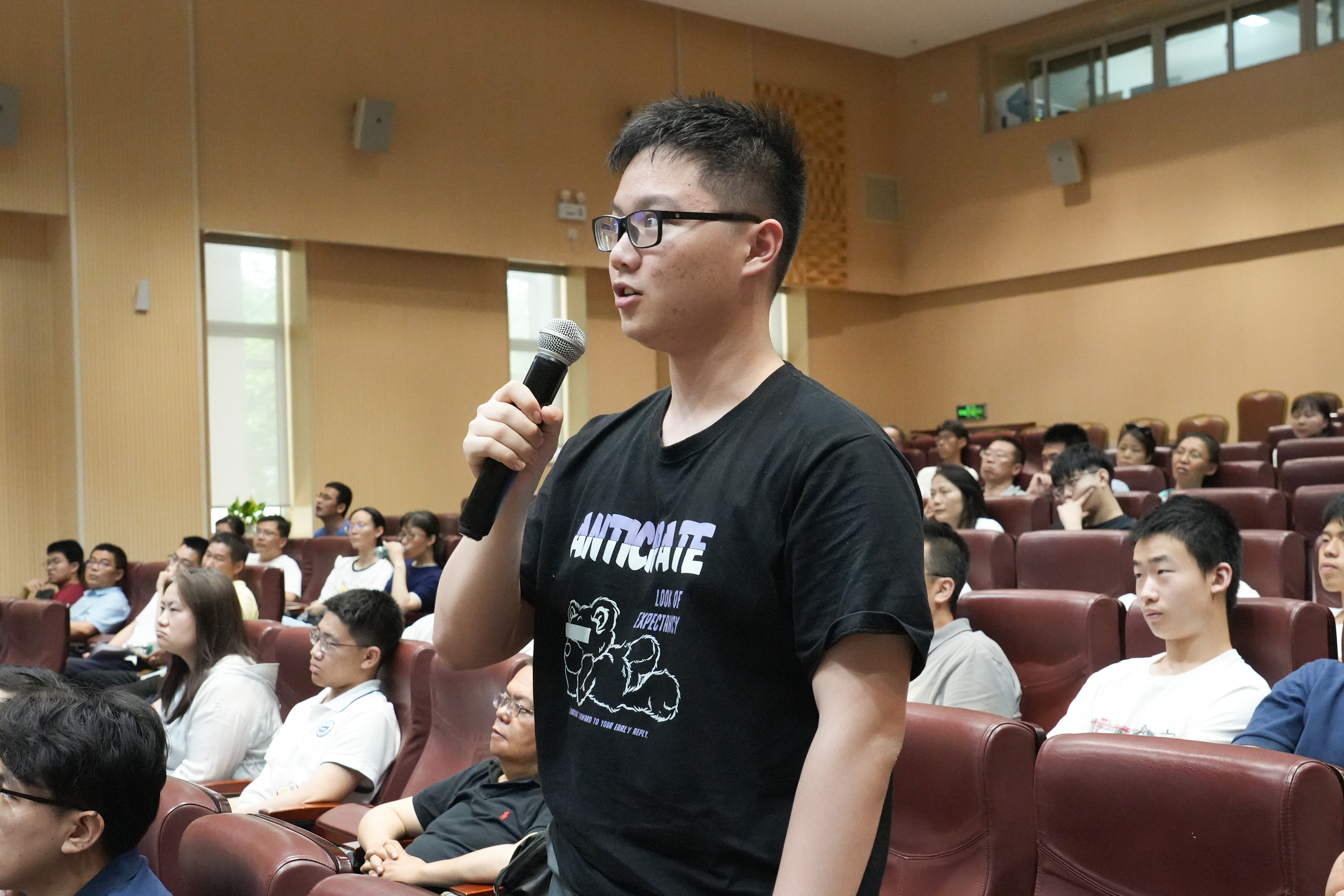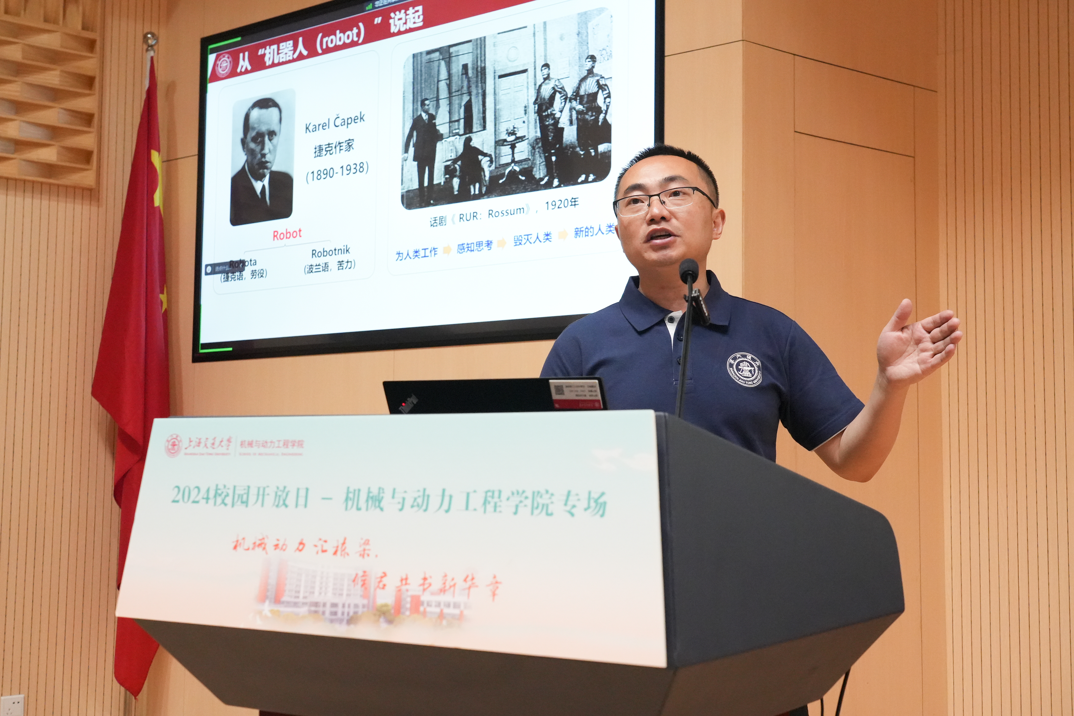 何俊教授作“六足机器人”文治讲堂宣讲,通过社会需求、足式机器人概念等,介绍了学院六足机器人的前沿自主研究,展示了学院机器人学科的培养体系及研究成果,并与现场学生积极互动。