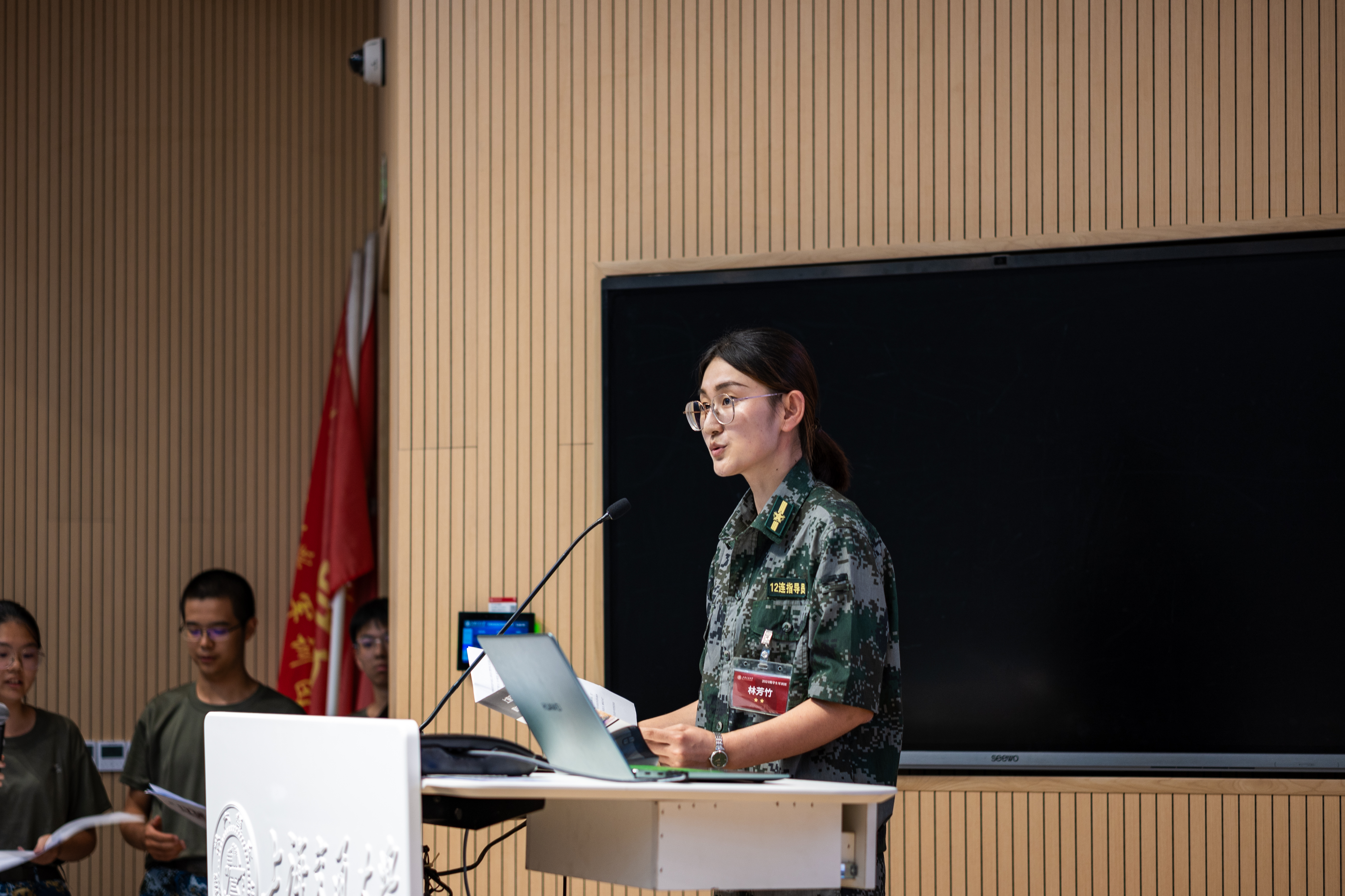 2024级年级思政组长林芳竹作学院学生参训情况汇报,表示参训学生在作训、政工和内务等方面均取得了优异成绩,希望参训学生继续树立“安全第一”的思想,践行交大“军政双训”的理念,在丰富的军训活动中强健体魄、强化纪律、磨练意志、锤炼作风。