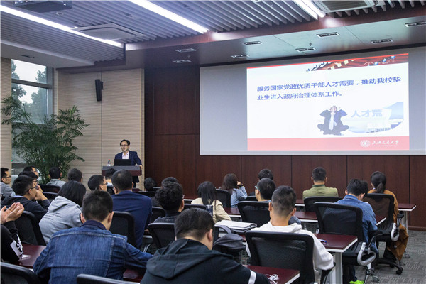 10月16日下午,hga010网页登录选调生就业政策解读讲座暨基层就业研习会成立仪式于学院振华会议室举行。上海交通大学学指委副秘书长、就业中心主任侯士兵,hga010网页登录党委副书记顾希垚,职业发展中心主任阮海涛,对基层就业有意向的本科生、研究生近百人参加本次讲座。讲座由阮海涛主持。